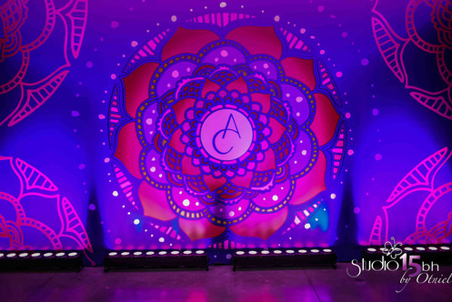 A mandala que foi usada como logomarca e exposta no backdrop da recepção expõe bem a temática voltada pras flores na festa.